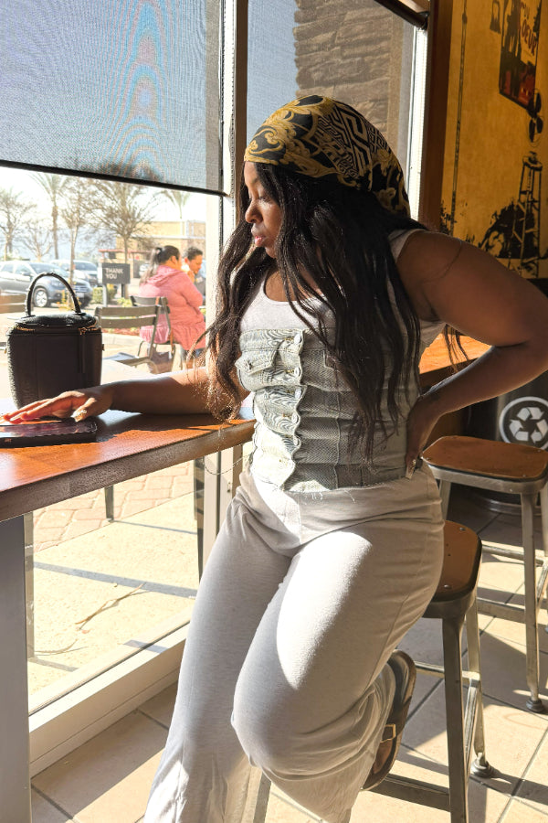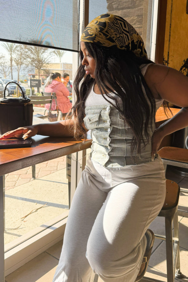 Denim Bustier Top: Elastic Button-Up Street Fashion Keywords: denim bustier, street style top, elastic tube top, button-up crop, edgy denim, urban fashion, trendy statement piece |