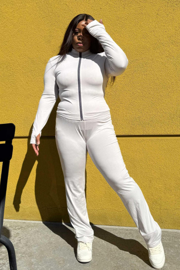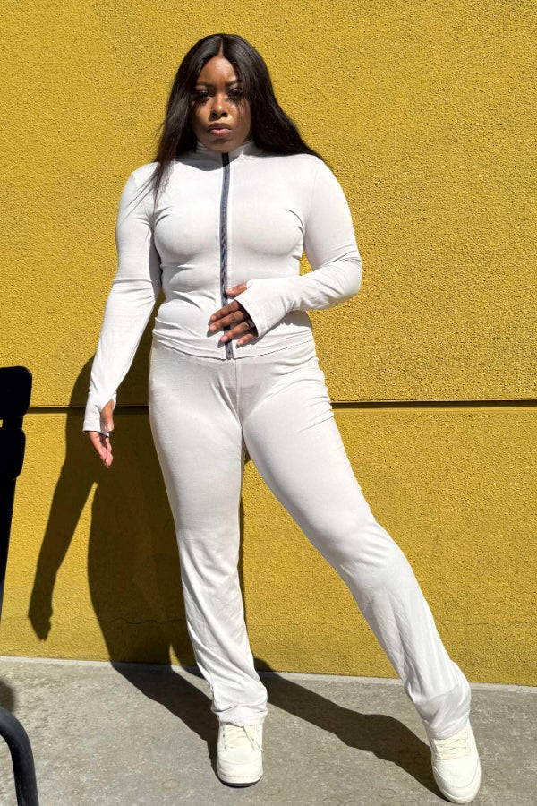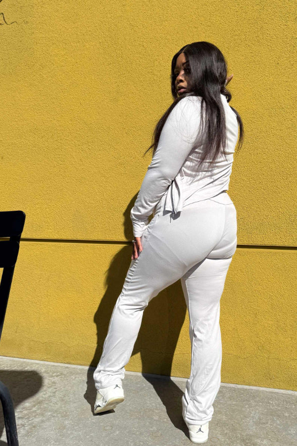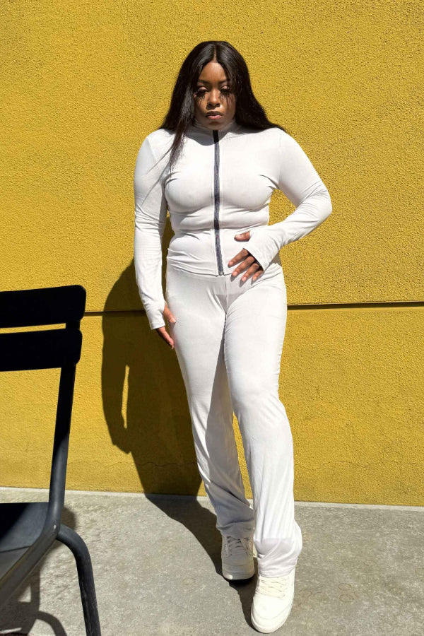 Keywords: slim fit set, fall collection, pattern design outfit, form-fitting two-piece, stylish fall fashion, trendy autumn set, casual chic