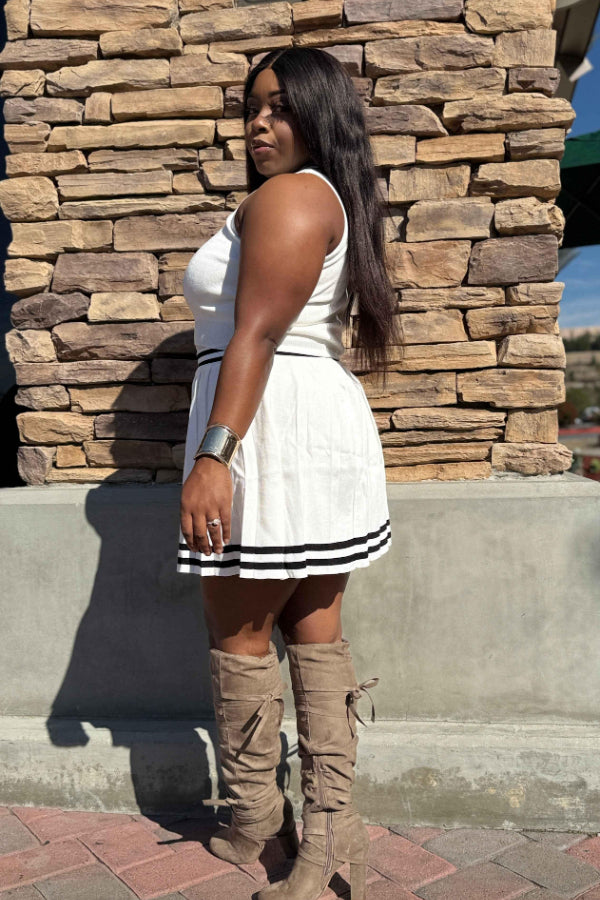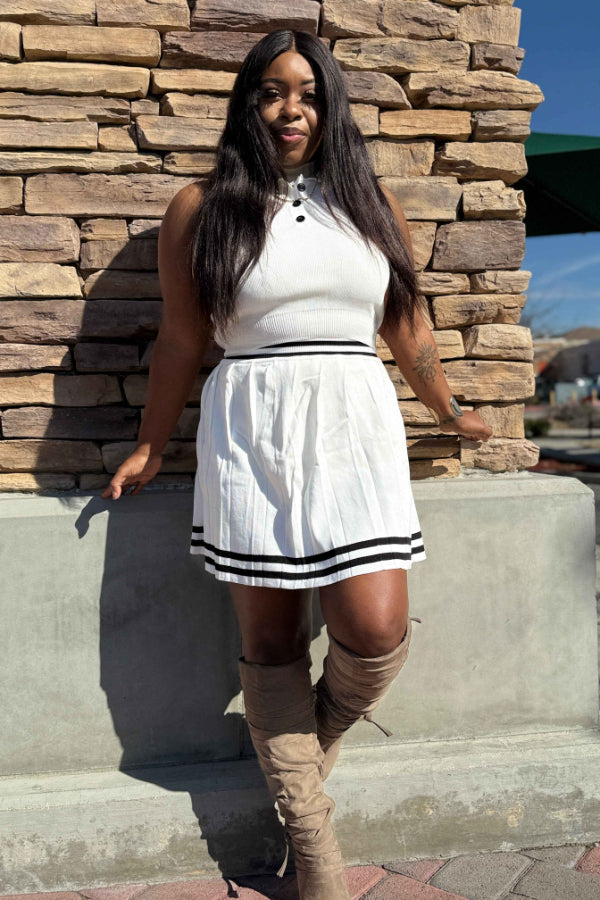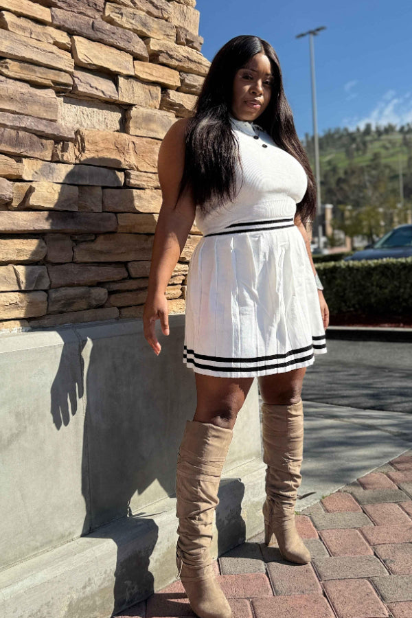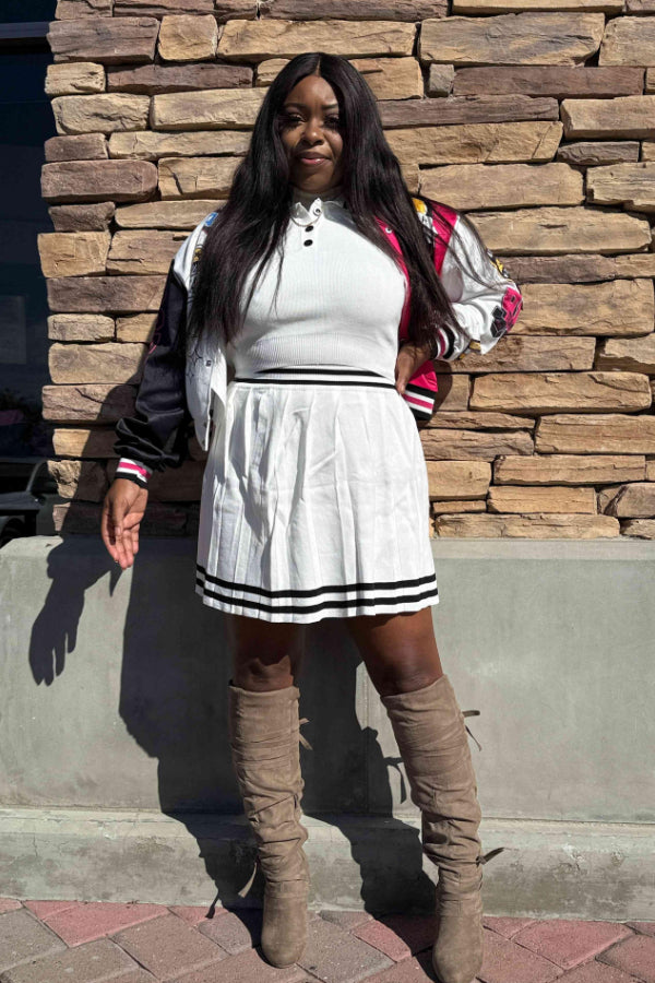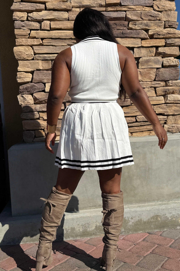 Striped Pleated Skirt Set: Knitwear Lapel Button-Up Design Keywords: striped pleated skirt set, knitwear outfit, lapel button-up top, preppy fashion, elegant two-piece, autumn-winter outfit |