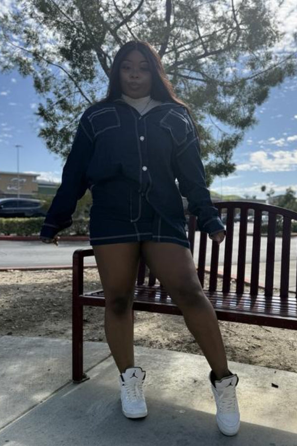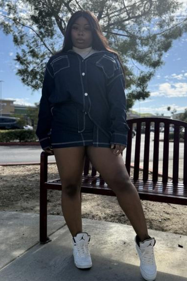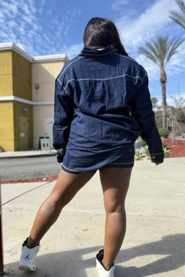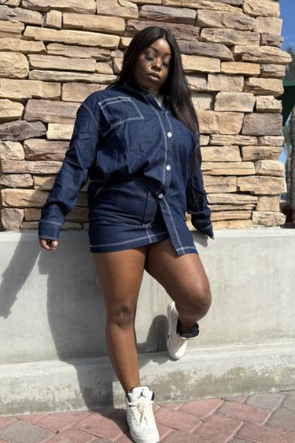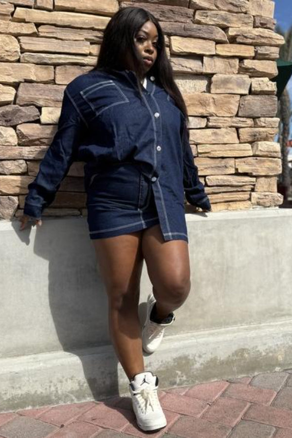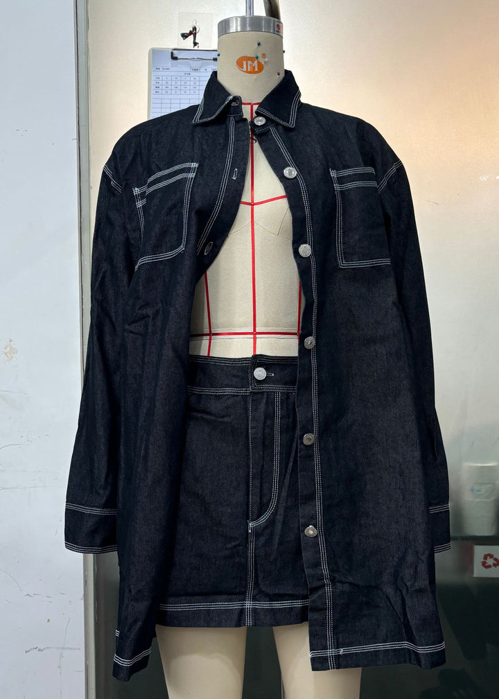 Vintage Denim Two-Piece Set: Shirt Jacket + Skirt Combination Keywords: vintage denim set, denim shirt jacket, denim skirt outfit, two-piece denim set, retro fashion, casual chic |
