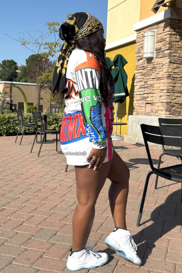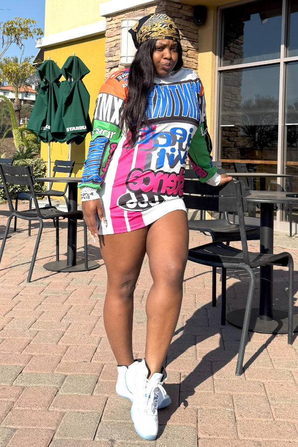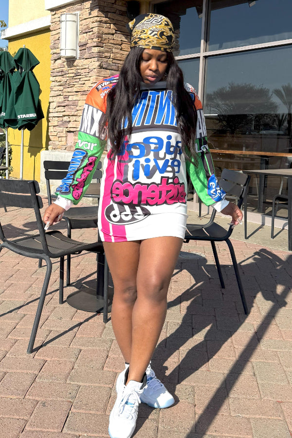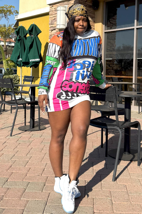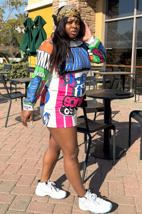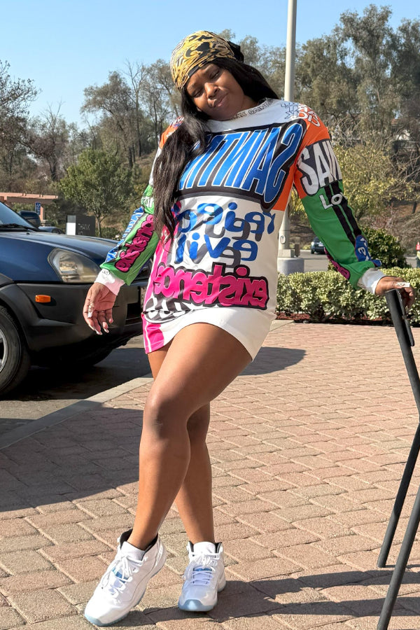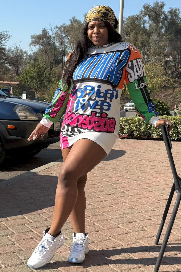 Vintage Graffiti T-Shirt Dress: Color Block Long Sleeve Loose Mid-Length Keywords: vintage graffiti dress, color block t-shirt dress, oversized long sleeve dress, graffiti print dress, casual street style, loose fit dress, mid-length t-shirt dress, urban fashion |