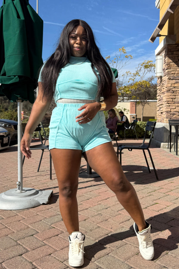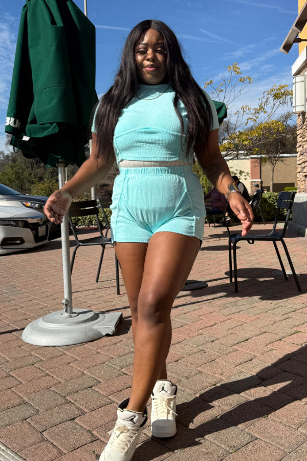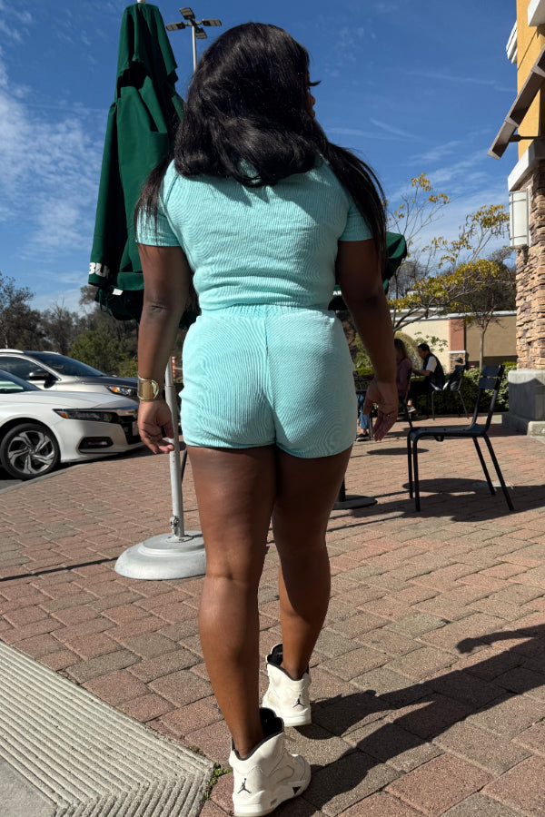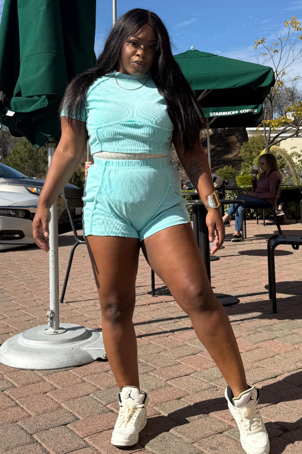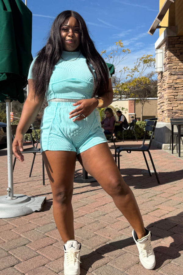 Washed Distressed Shorts Set: Ribbed Faded Design Keywords: washed shorts set, distressed shorts, faded design outfit, ribbed shorts, casual two-piece, trendy summer set, vintage style |
